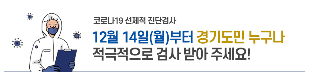 12월 14일 부터 3주간 경기도민 누구나 증상여부와 관계없이 코로나 검사를 받을 수 있는 임시 선별진료소(검사소)가 운영됩니다.